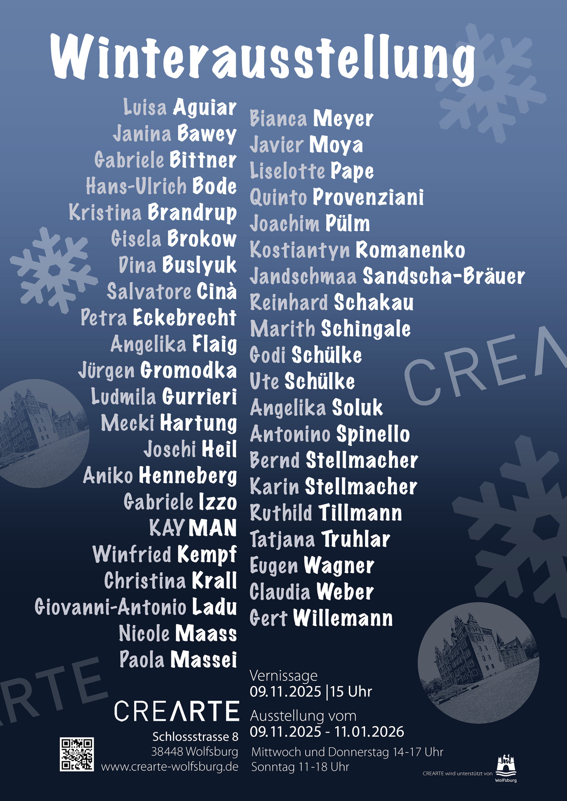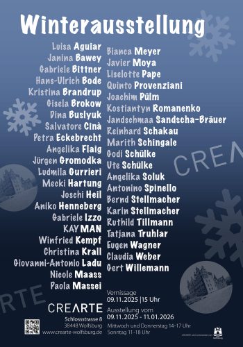 ein wenig Farbe in den grauen November bringen – das gelingt mit einem Besuch der traditionellen Winterausstellung des Kunstvereins CREARTE. 42 Künstlerinnen und Künstler bringen mit ihren Werken Farbe und Vielfalt in die Ausstellungsräume im Westflügel von Schloss Wolfsburg. Sie zeigen auf vielfältige künstlerische Weise, was sie in den letzten Monaten beschäftigt und inspiriert hat, es in Kunst umzusetzen. Themen wie Techniken sind so vielfältig wie unterschiedlich.